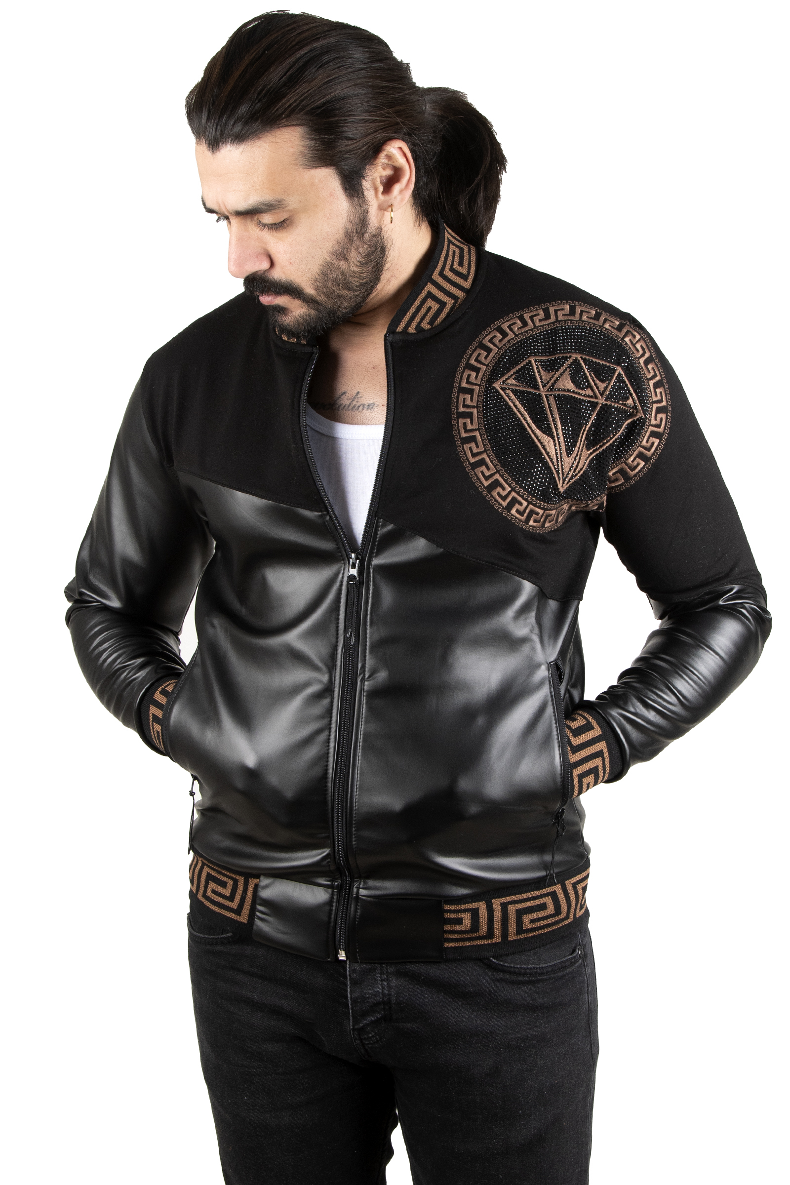 DeepSEA Siyah Taş İşlemeli Erkek Suni Deri Mont / Ceket – Kolej Yaka • Ribanalı • Şık & Sportif Ceket 2300403