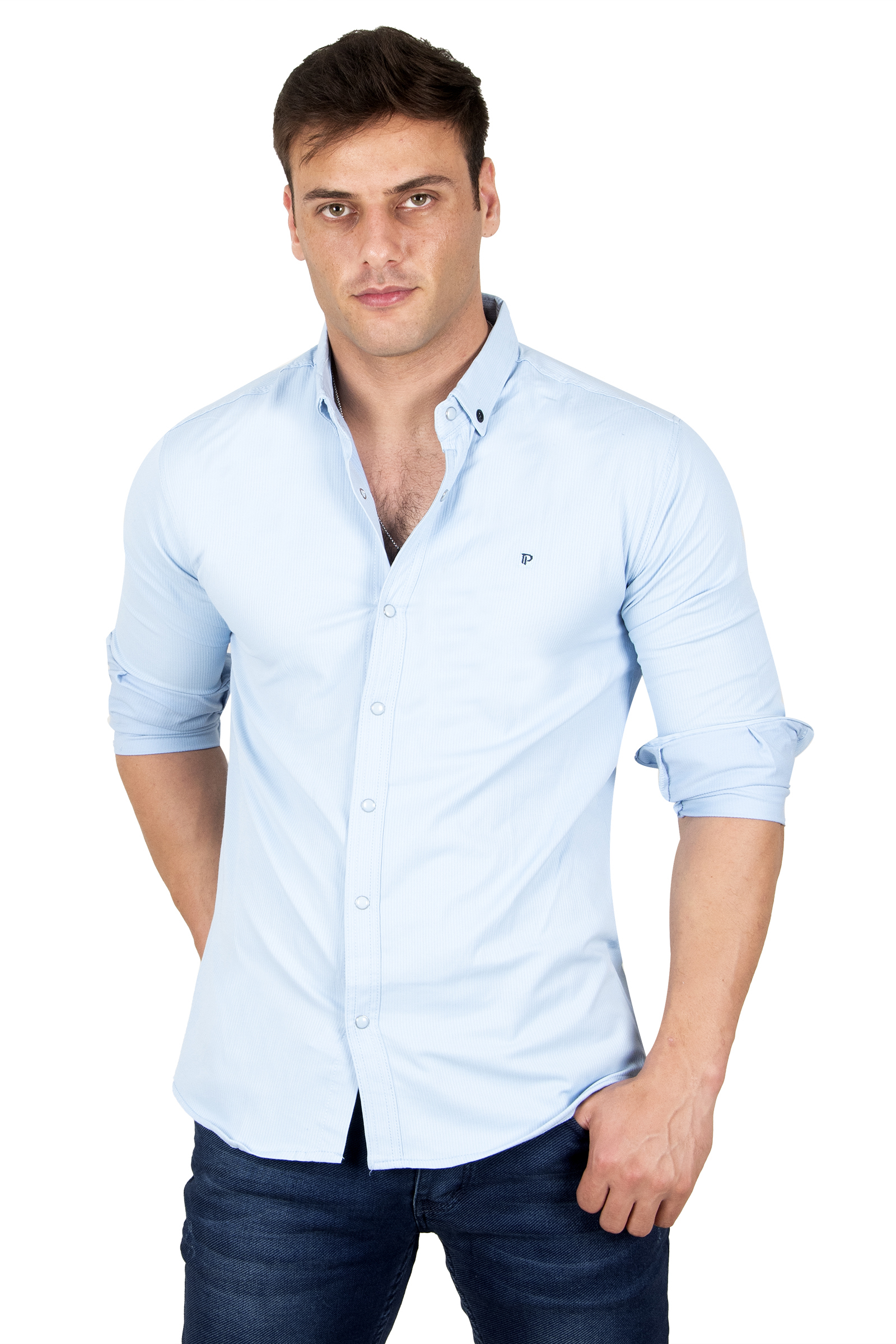 DeepSEA Buz Mavisi Slim Fit Çıtçıtlı Spor Gömlek Dar Kesim Pamuklu Gabardin Gömlek 2300413