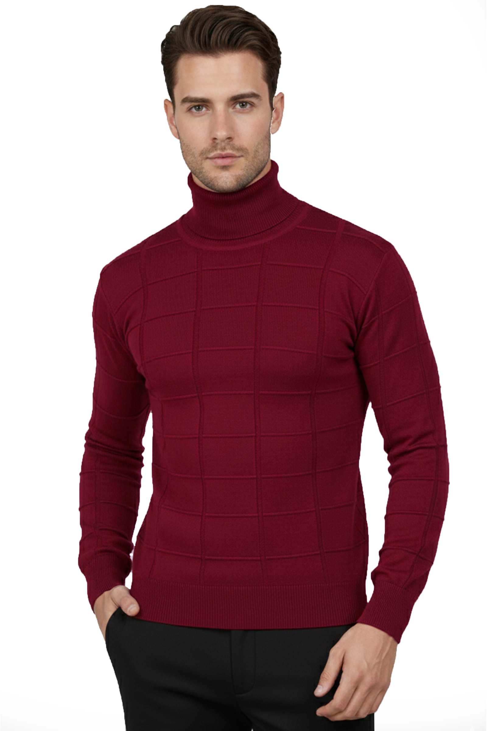 DeepSEA Bordo Kare Desenli Balıkçı Yaka Kazak Slim Fit Boğazlı Triko Kazak 2505493