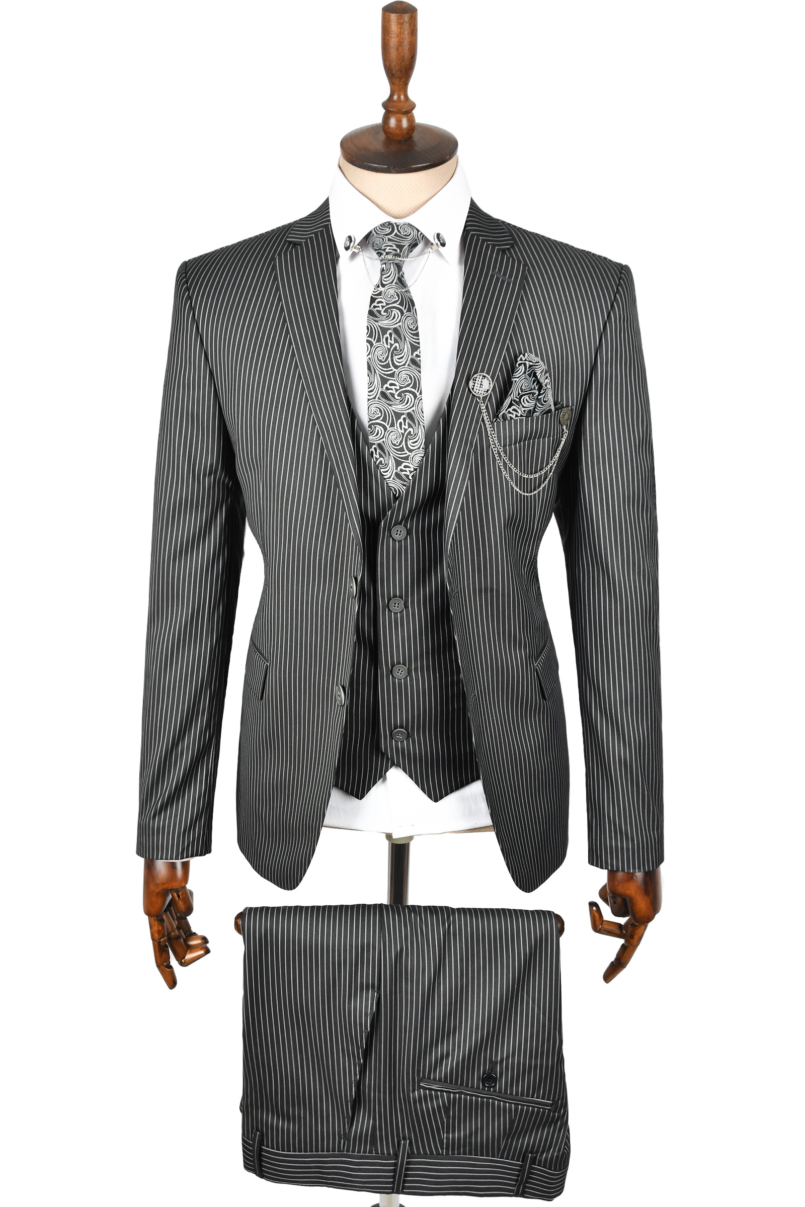Detay: Ceket yelek ve pantolon olarak satılmaktadır. çift düğme, astarlı, cepli çift yırtmaçlı çizgili üçlü takım elbise. Yaka cebi mevcuttur. İçi astarlıdır. Yan cepleri mevcuttur. Sivri yakalı  slim fit model italyan kesim üçlü takım elbise. Özel günlerinizin tercihi olabilecek bir modeldir.