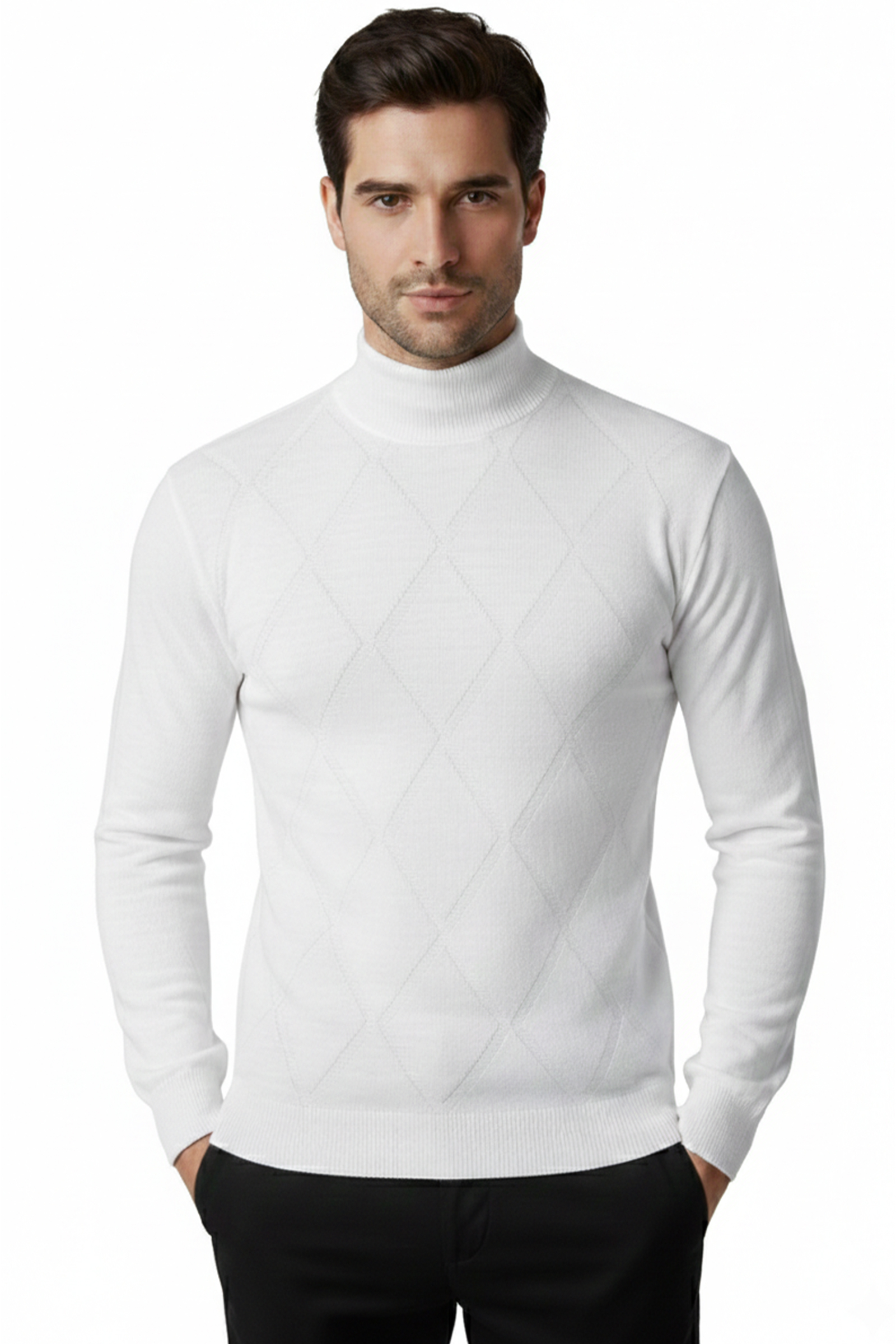 DeepSEA Beyaz Baklava Desenli Slim Fit Yarım Boğazlı Likralı Erkek Triko Kazak 2505508