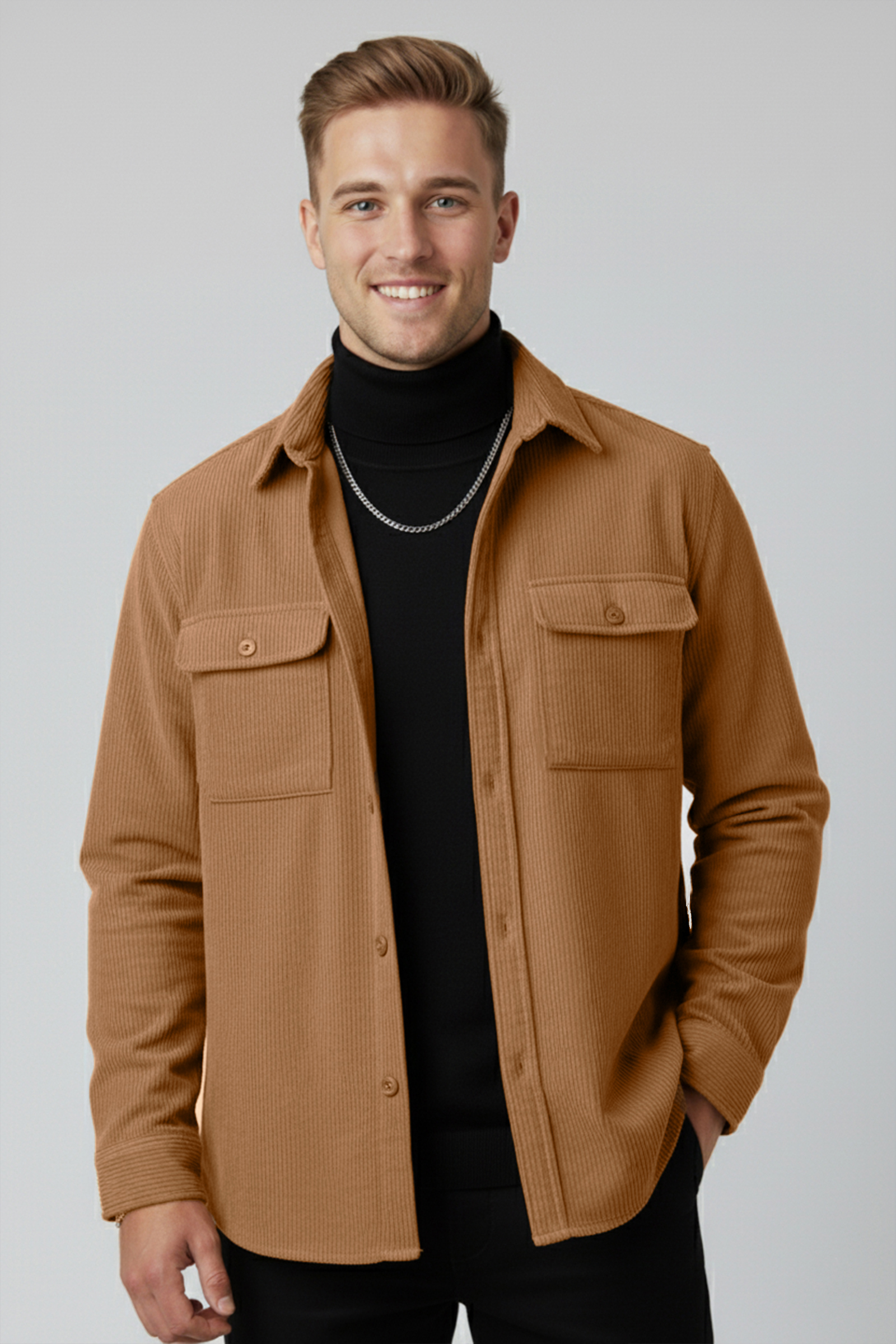 DeepSEA’nin fitilli kadife kumaştan üretilen bu cepli gömleği, yumuşak dokusu ve rahat kesim kalıbı ile gün boyu konfor sağlar.