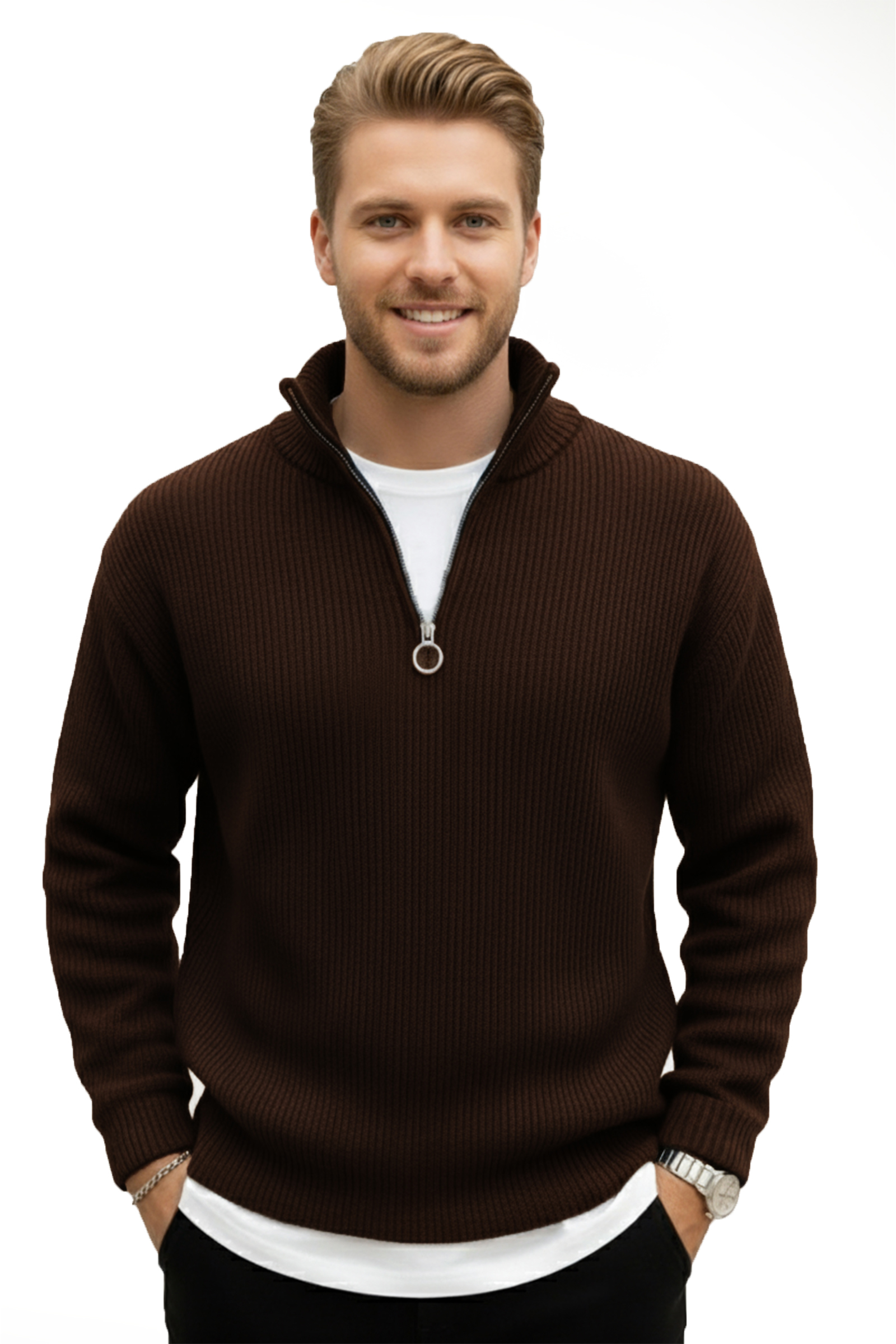 DeepSEA Kahve Erkek Yarım Fermuarlı Oversize Kesim Triko Kazak – %100 Pamuk, Yumuşak Dokulu Örgü Kazak 2608511