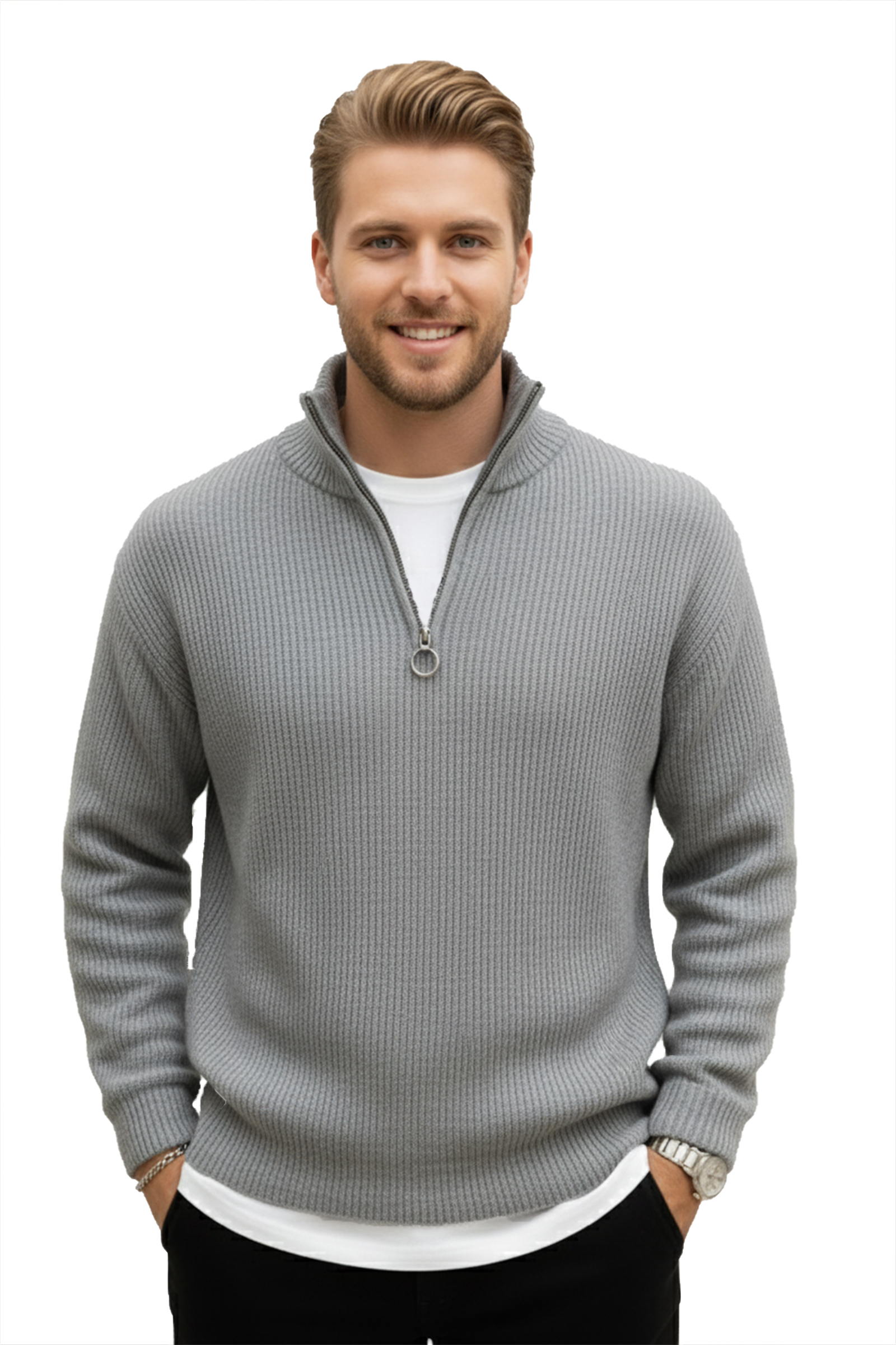 DeepSEA Gri Erkek Yarım Fermuarlı Oversize Kesim Triko Kazak – %100 Pamuk, Yumuşak Dokulu Örgü Kazak 2608511