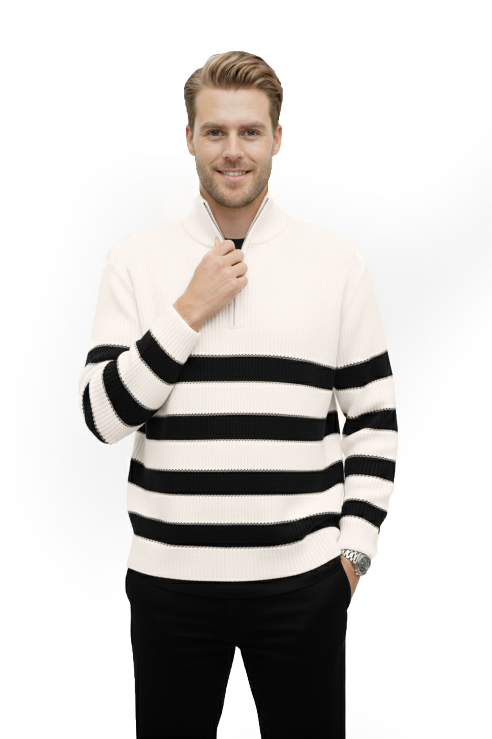 DeepSEA Ekru Erkek Yarım Fermuarlı Oversize Kesim Triko Kazak Pamuklu Yumuşak Örgü Çizgili Kazak 2608513