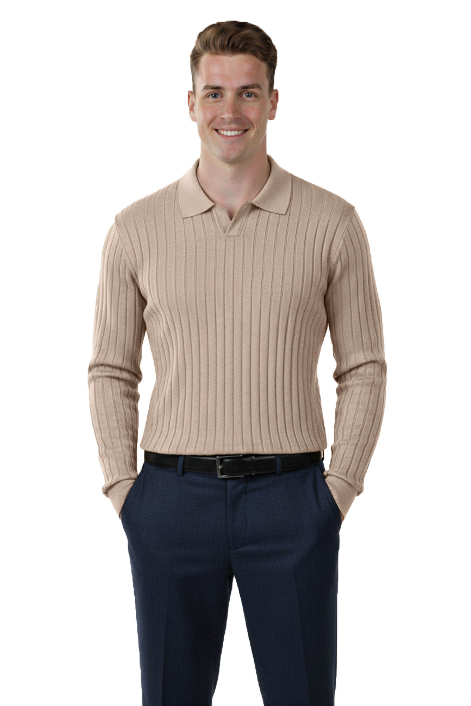 ✔️ DeepSEA erkek polo yaka fitilli triko kazak, minimal çizgili dokusu ve modern formu ile sade ama etkileyici bir stil sunar.