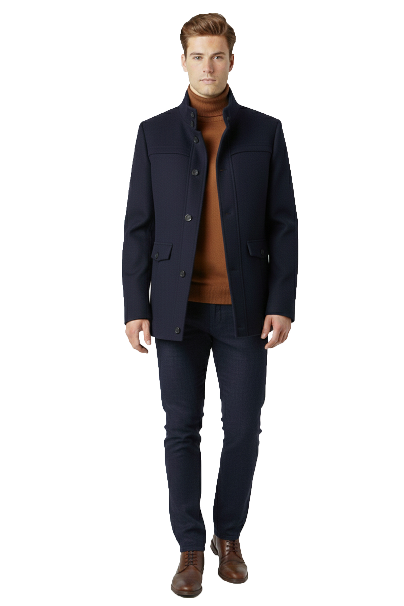 DeepSEA Lacivert Regular Fit Dik Yaka Kışlık Erkek Kaşe Kaban – Düğmeli & Fermuarlı – Tek Yırtmaç 2407006