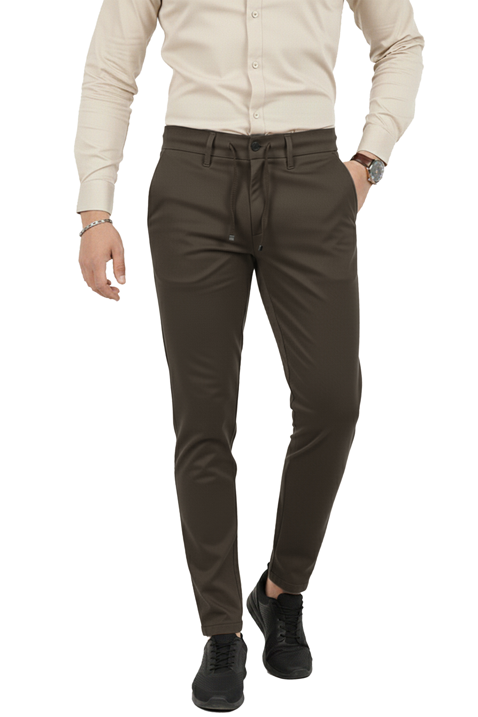 DeepSEA Kahve Erkek Likralı Beli Lastikli & İpli Dar Kesim Şık Kumaş Pantolon 2600572