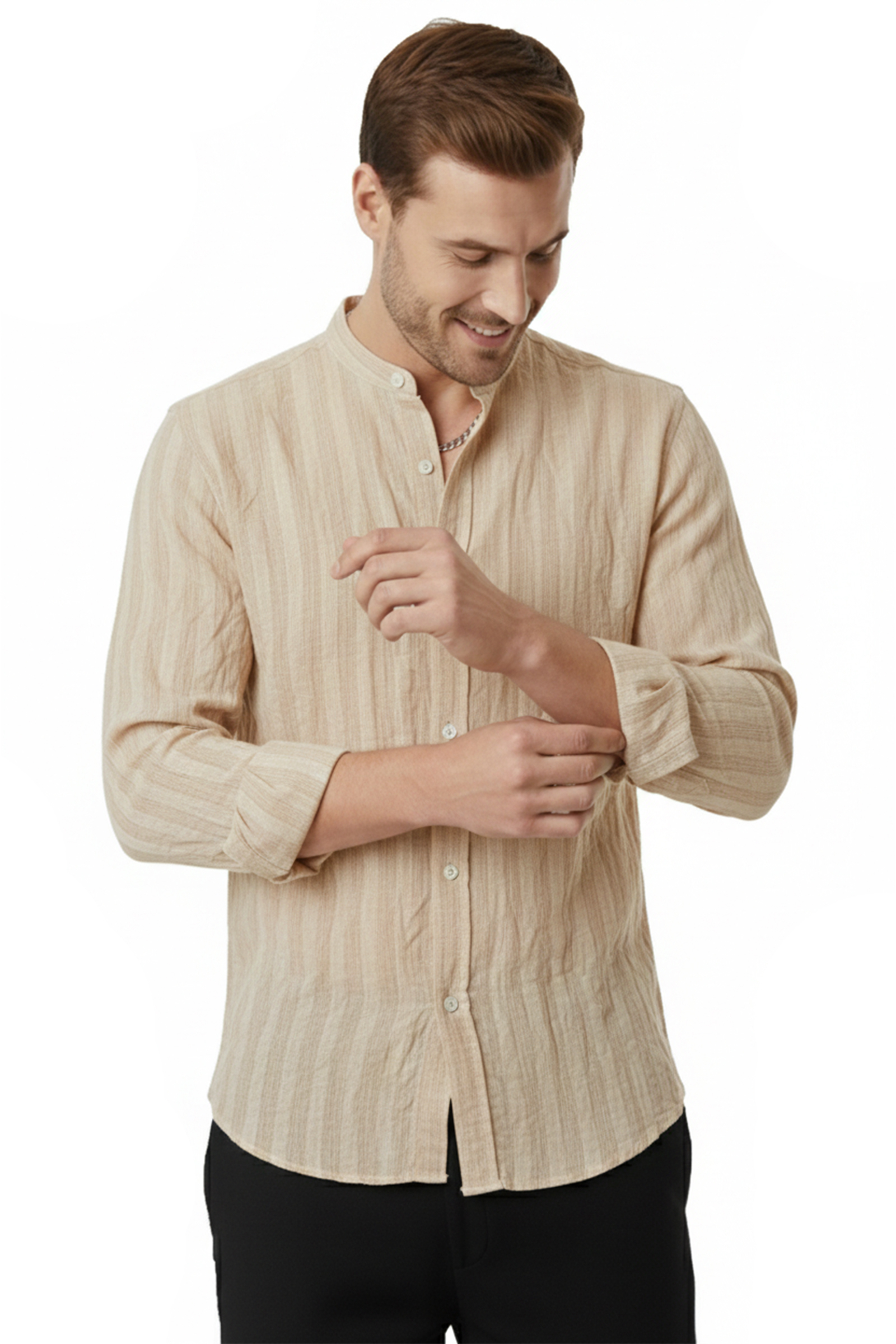 DeepSEA Bej Çizgi Dokulu Hakim Yaka Rahat Kalıp Kırışık Viskon Keten Erkek Gömlek 2602621