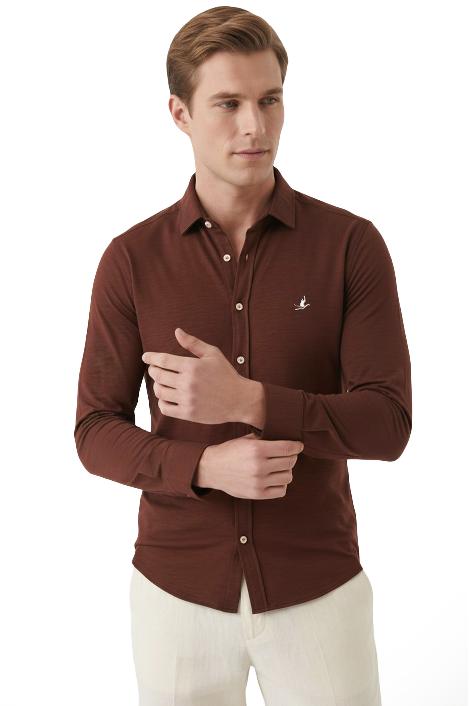 ✔️ DeepSEA modal kumaş erkek gömlek, sade görünümünü modern arma ve düğme detayları ile tamamlayan şık bir tasarıma sahiptir.
