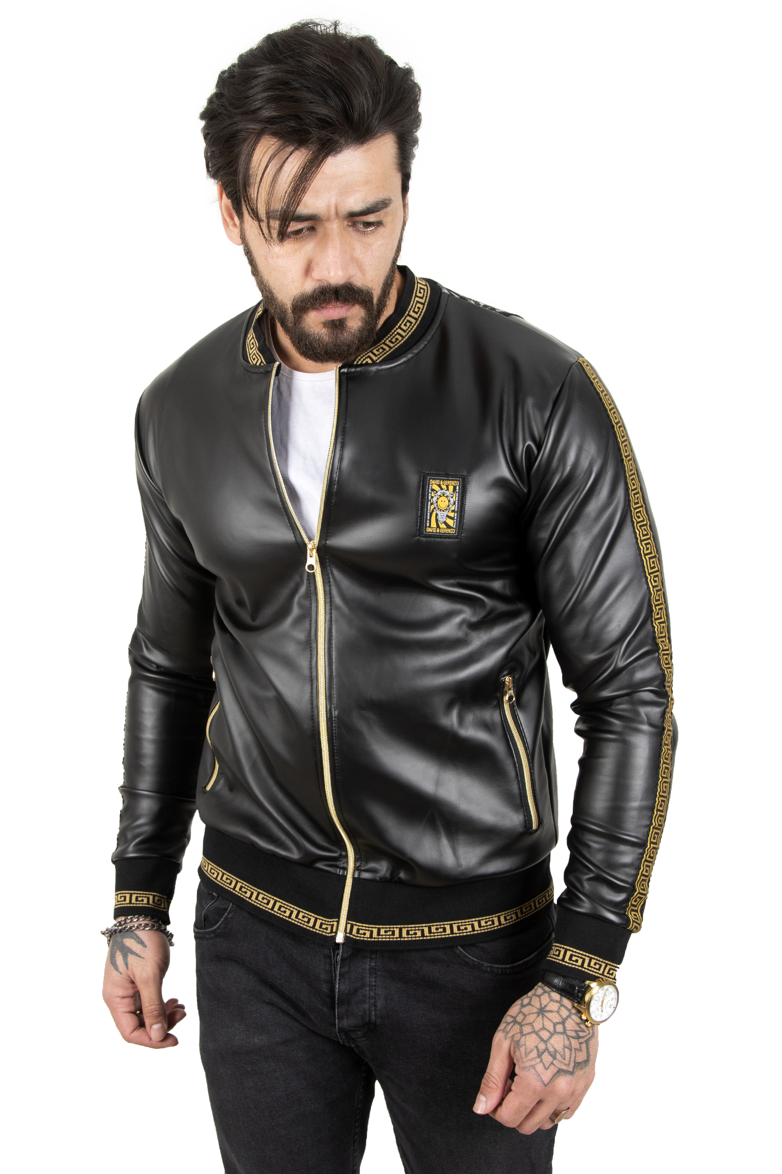 deepsea deri mont, deepsea deri ceket, erkek suni deri mont, erkek suni deri ceket, arkası baskılı mont, gold detaylı erkek ceket, siyah bomber mont, pamuk polyester mont, likralı deri ceket, şık erkek mont, modern erkek dış giyim